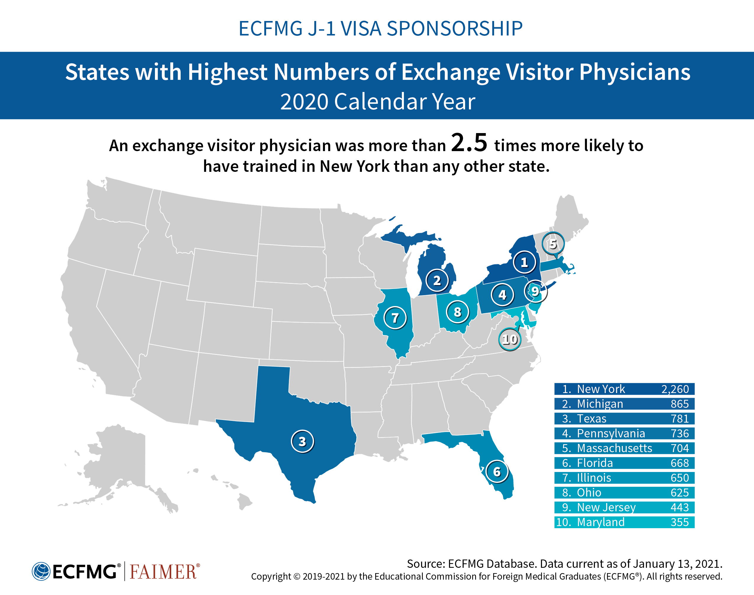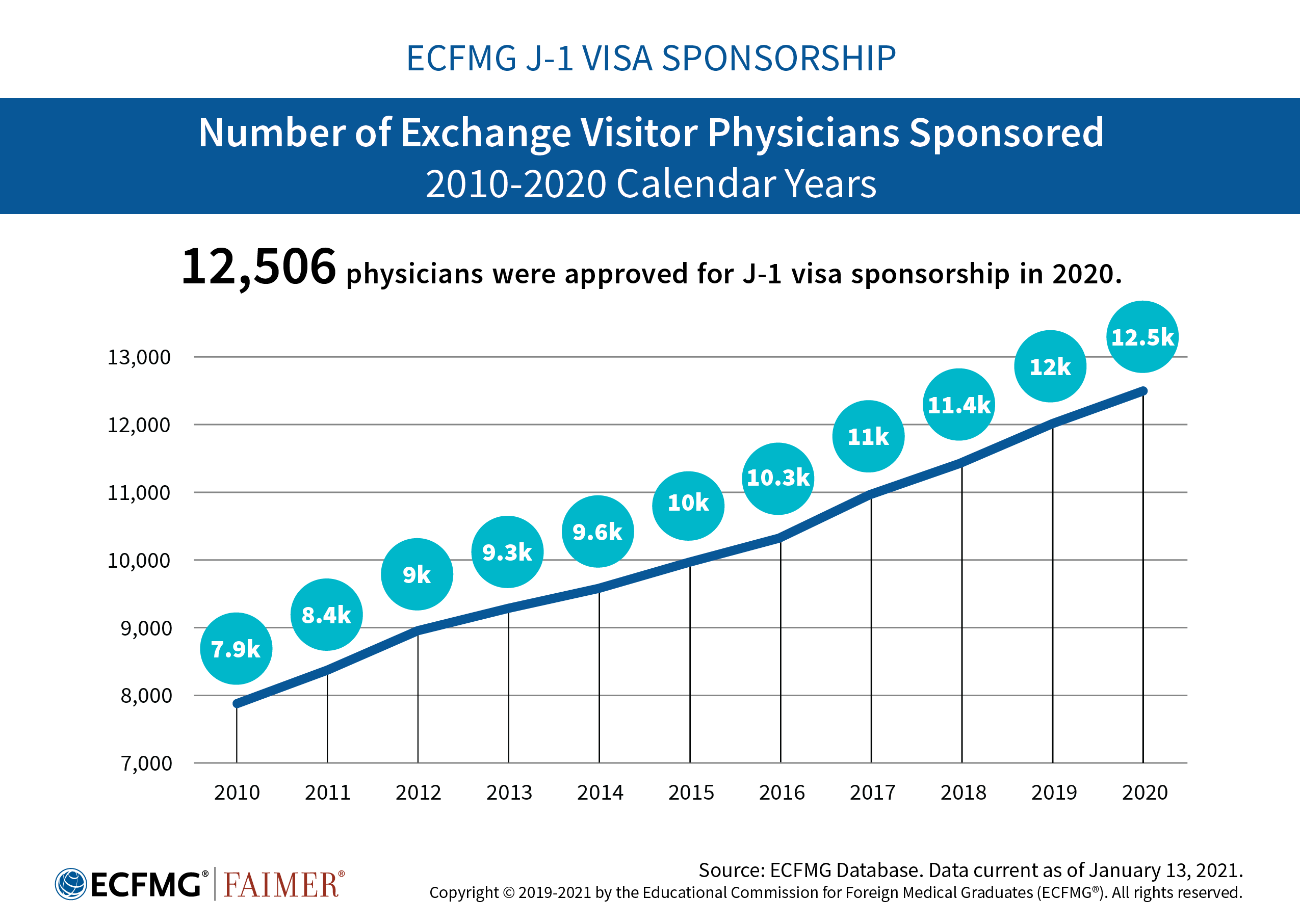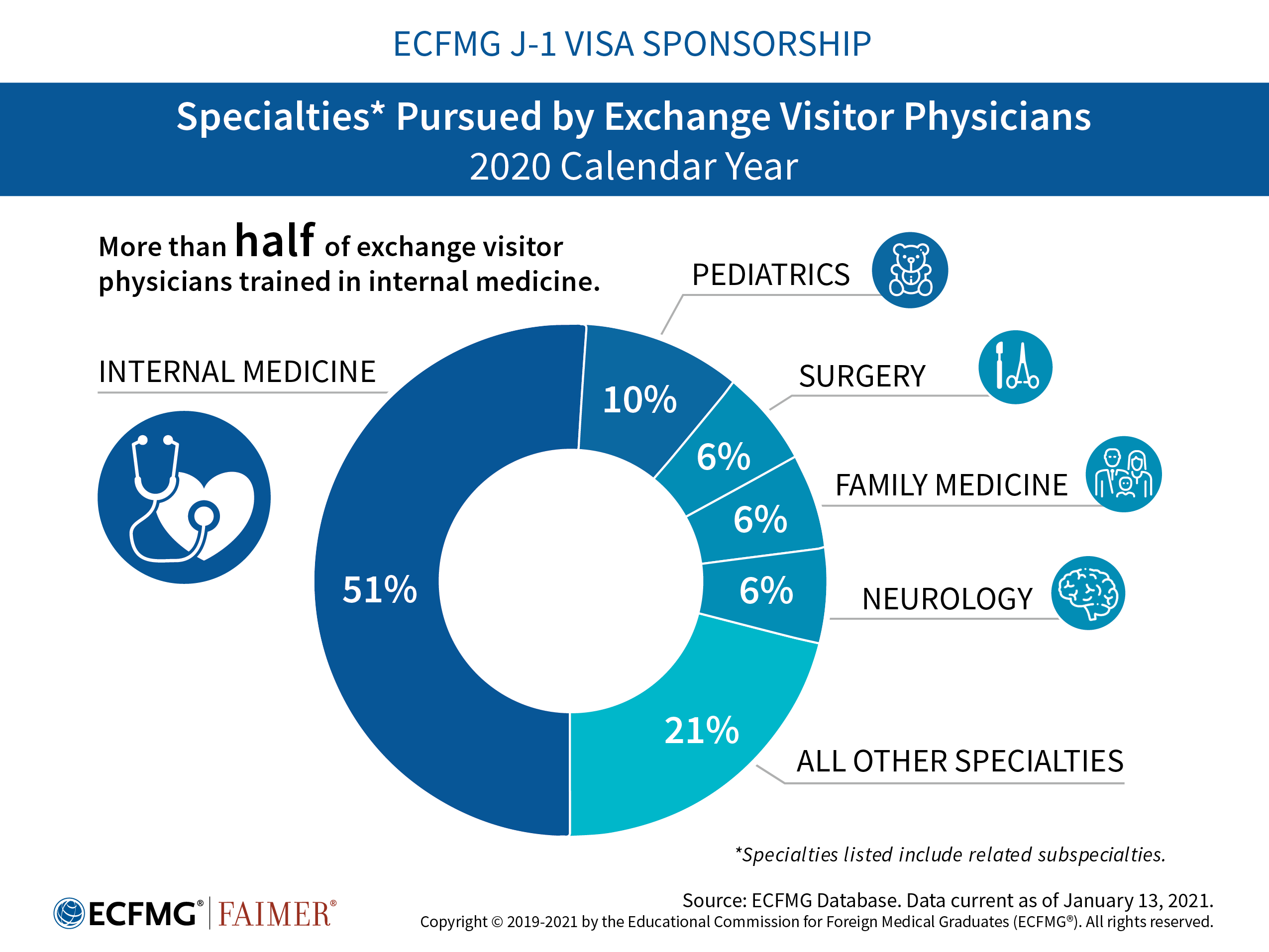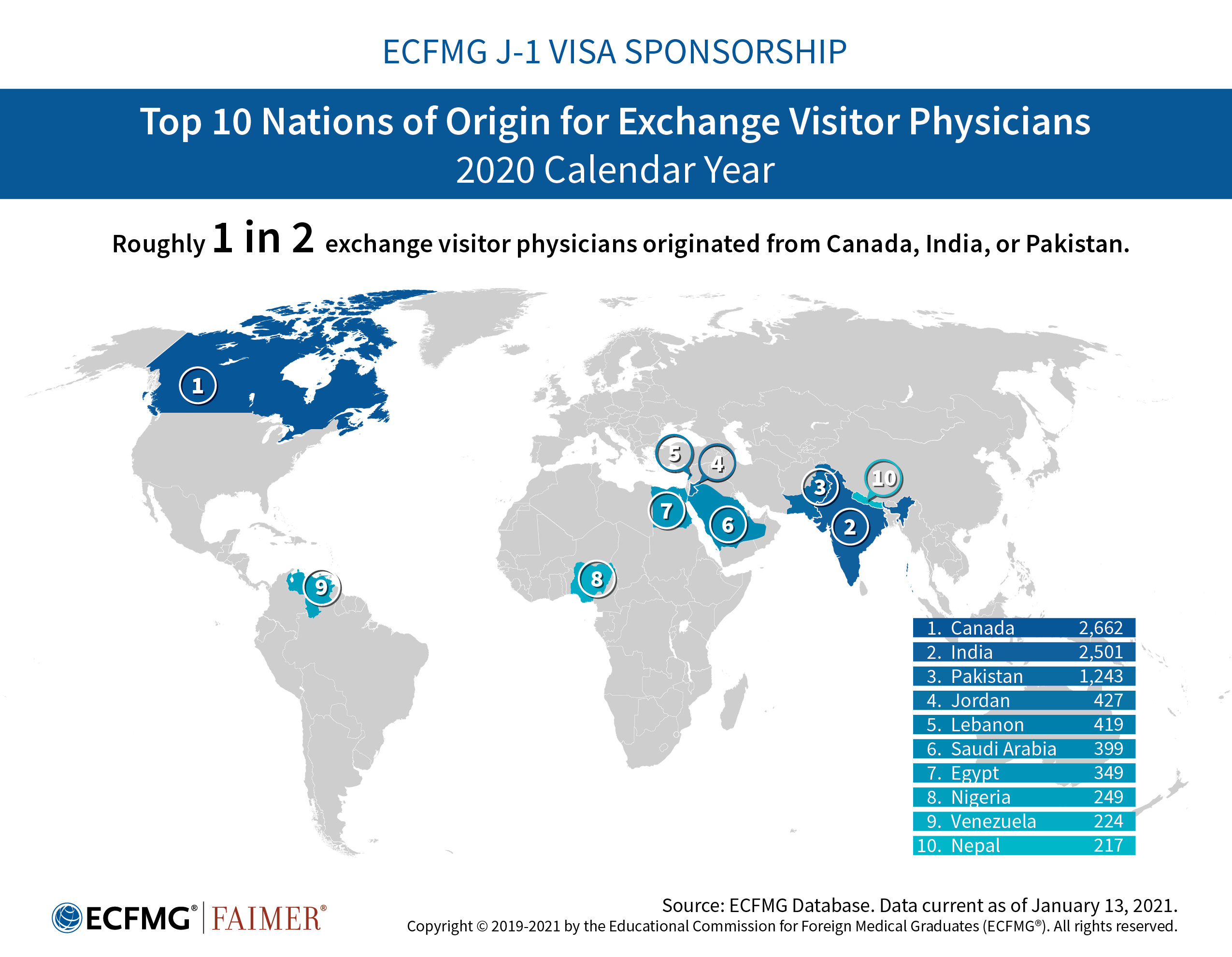 The infographics below describe the foreign national physicians participating in ECFMG’s J-1 Exchange Visitor Sponsorship Program (EVSP).